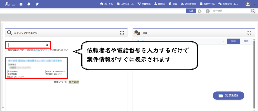 以前は、電話が鳴って依頼者名を聞いても、Excelファイルやフォルダの中から該当の事件を探し出すのに時間がかかっていました。今はポータル画面で依頼者名や電話番号を入力すればすぐに表示され、電話の取次ぎが格段にスムーズになりました。